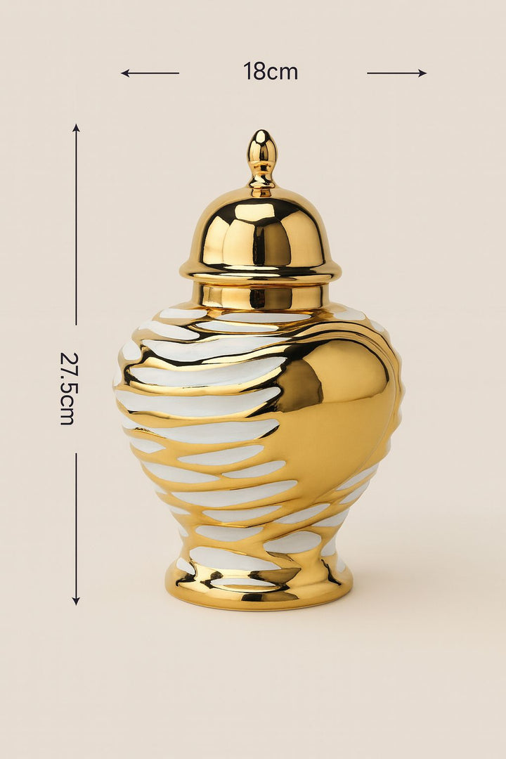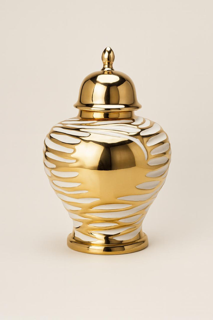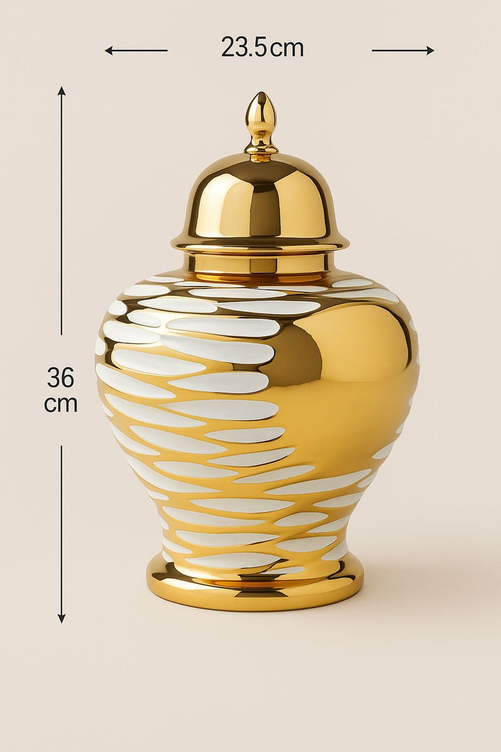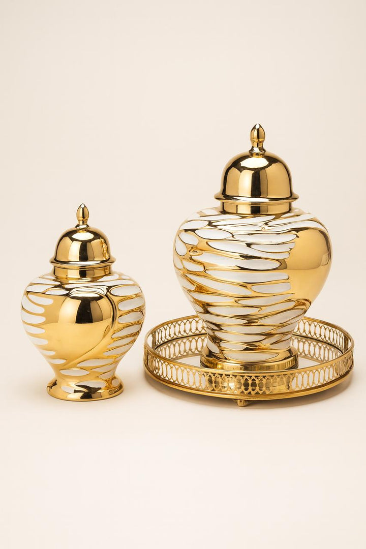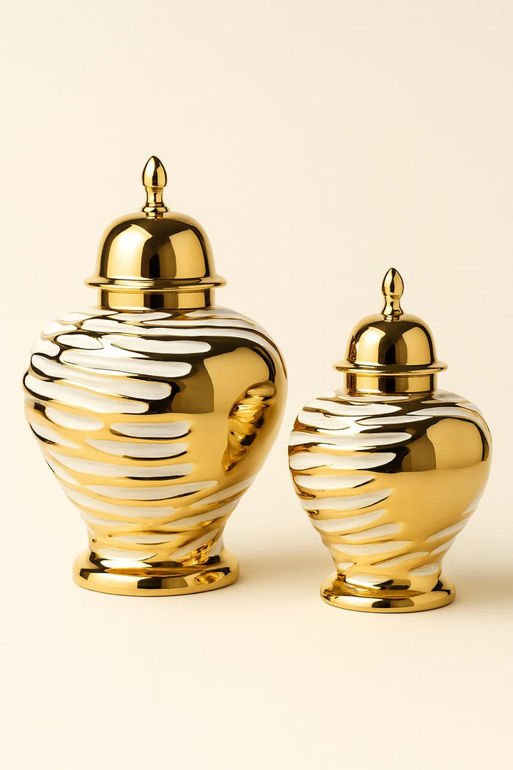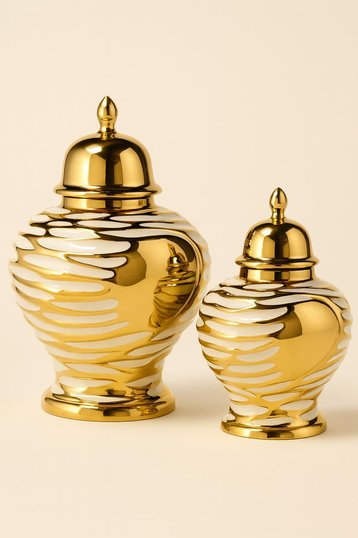 Radiating modern elegance, the Shein | Metallic Gold & White Temple Jars by Noir Home are a bold statement of luxury décor. Designed with a striking metallic gold finish enhanced by soft white accents, these temple jars exude sophistication while keeping a contemporary edge. Their timeless silhouette makes them perfect as centerpieces, mantle highlights, or paired styling for upscale interiors.
